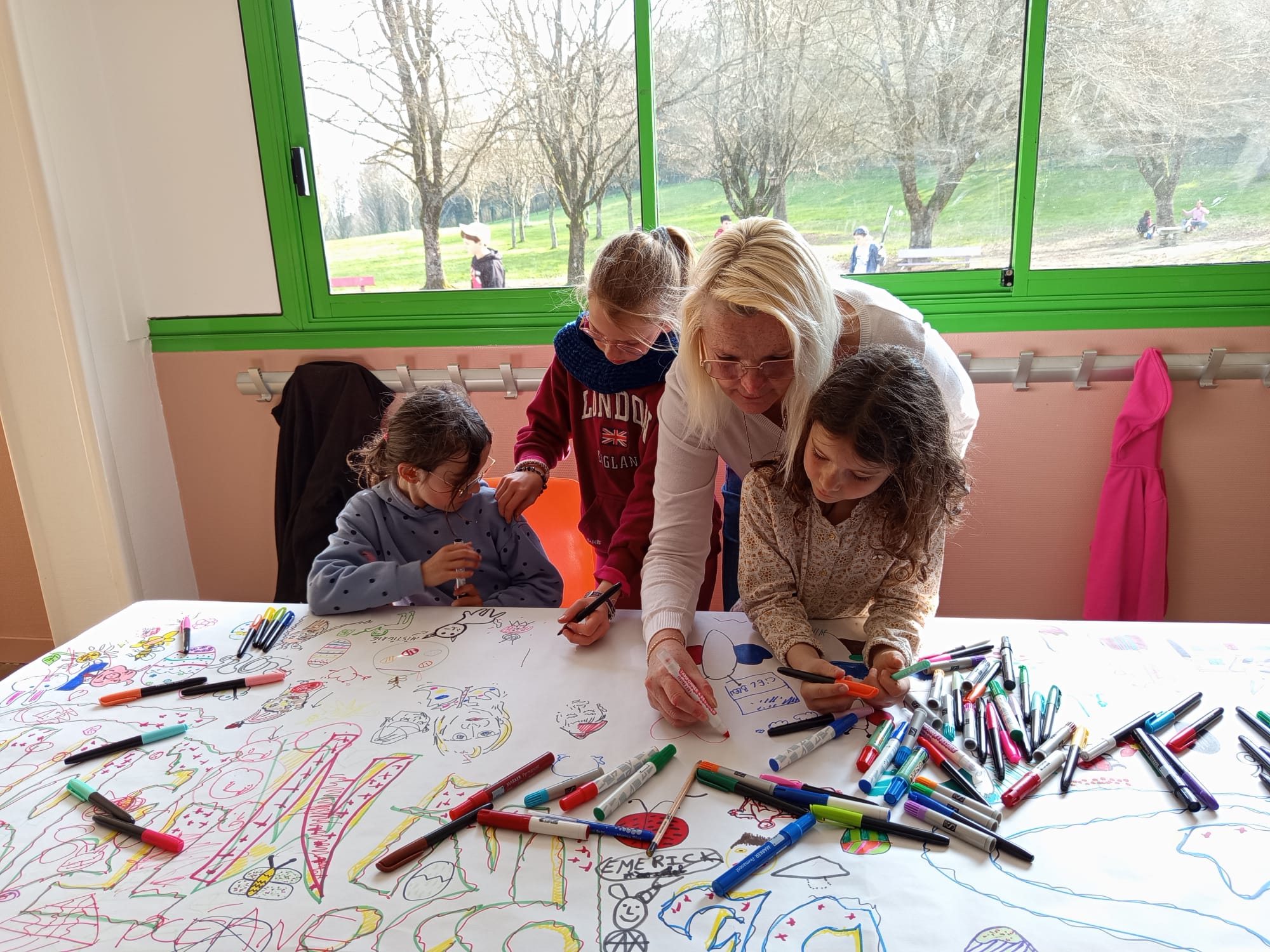 - Atelier peinture avec pour thème le printemps : Quels rêves le printemps peut-il susciter ? Fleurs, papillons, coccinelles, soleil… Les enfants dessinent sur la fresque leurs rêves. Une belle réalisation.