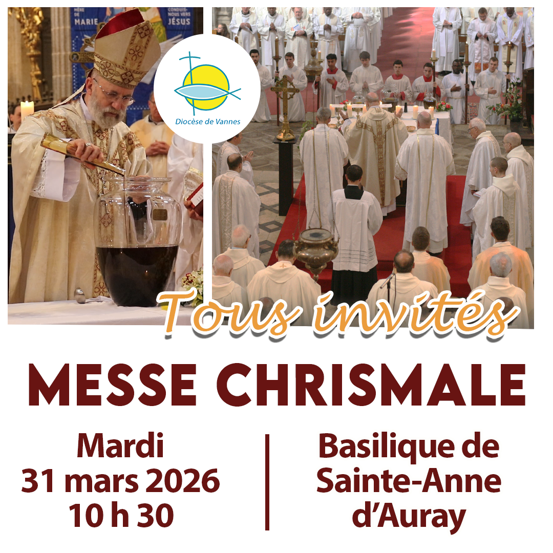 Mardi 31 mars, durant la semaine sainte, le peuple diocésain est invité à participer à la Messe Chrismale : un évènement ecclésial unique dans l’année, qui manifeste l’unité de notre diocèse. Au cours de ce rite essentiel, les prêtres rassemblés renouvelleront leurs promesses sacerdotales et Monseigneur Centène, évêque de Vannes bénira les saintes huiles et consacrera le saint chrême qui serviront aux sacrements.