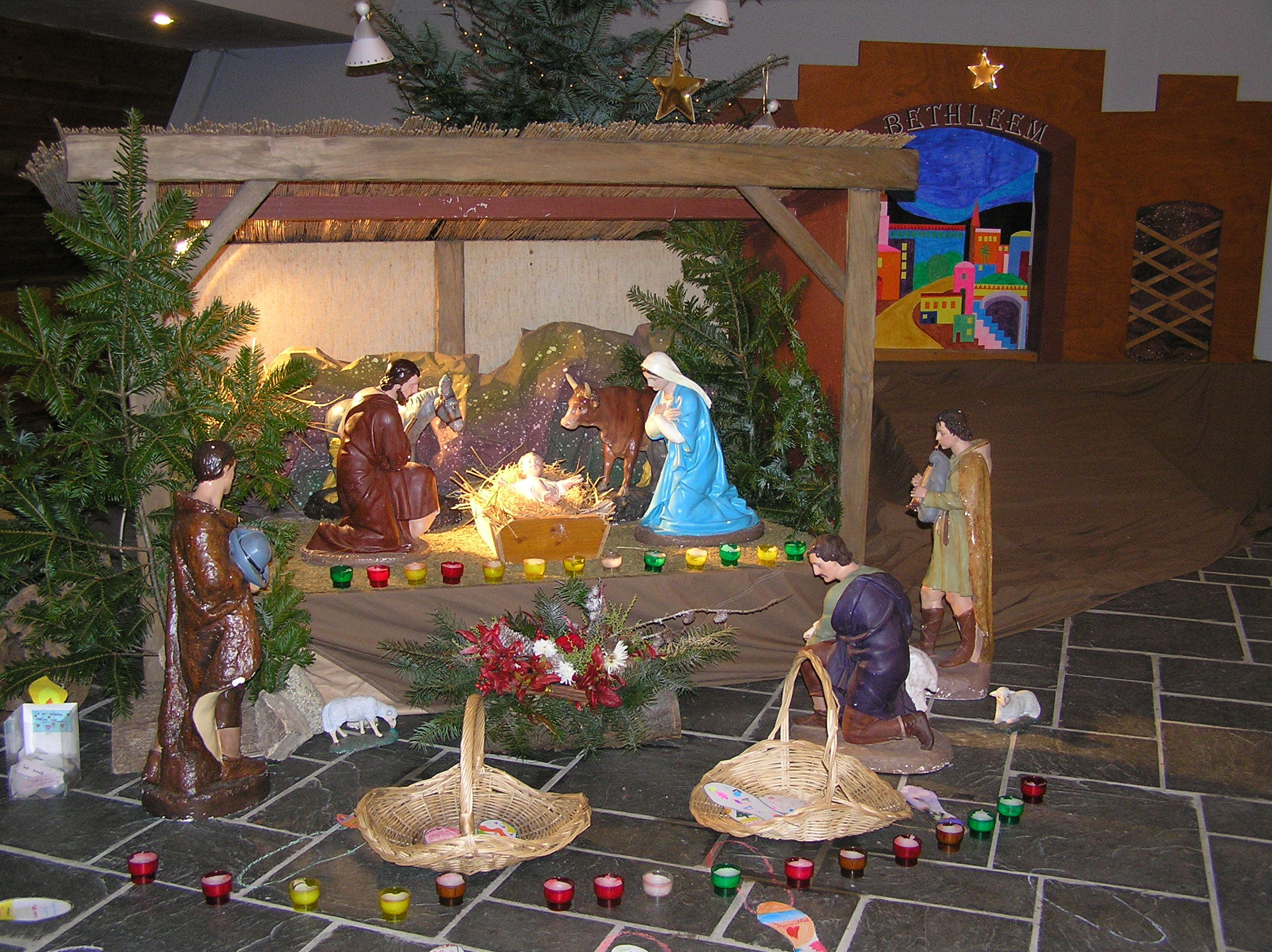 On s'arrête devant les dessins de l'autel : devant la cène et derrière la nativité, la crèche. On fait une halte dans la chapelle du Saint Sacrement où les enfants découvrent le tabernacle qui contient les hosties consacrées. Puis on se dirige vers la statue de Sainte Anne qui tient dans ses bras Marie à qui elle apprend à lire la bible.